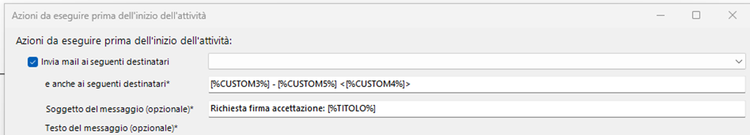 Affinchè il link venga creato correttamente, richiamando la pagina DOCSIGN.ASPX con le specifiche dell’utente che deve firmare e del suo numero di cellulare, è necessario che nell’evento “pre-esecuzione” della fase di firma sia previsto l’invio all’utente stesso con un indirizzo assemblato nel seguente modo: