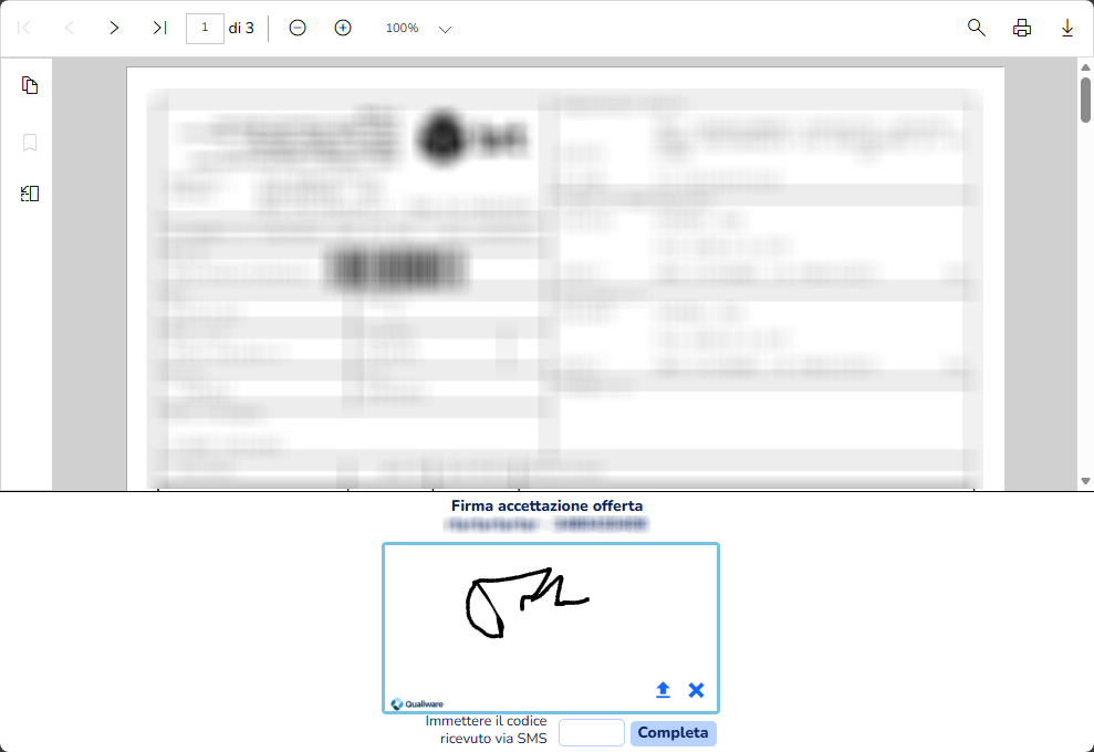 L’utente deve semplicemente firmare nell’apposito spazio, o caricare l’immagine della firma attraverso l’apposito pulsante di upload; nel caso di un utente esterno è necessario inserire il codice OTP ricevuto via SMS o via e-mail. Si completa il processo di firma cliccando il pulsante Completa. Il sistema aggiorna il documento PDF inserendo la firma autografa e ne salva una copia nell’Audit trail, assieme alla cronologia delle operazioni effettuate.
